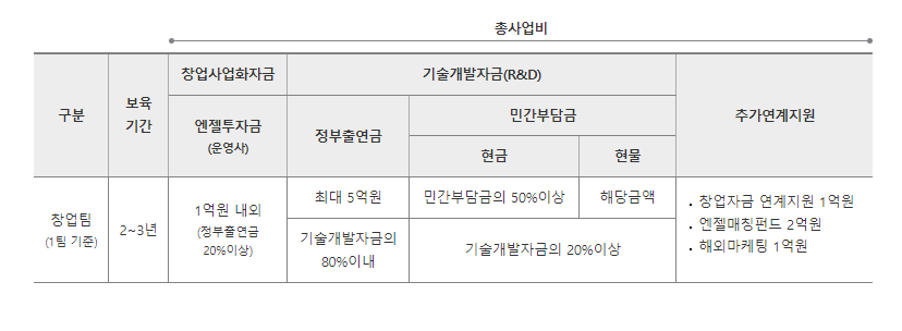 글로벌시장을 지향하는 기술력을 갖춘 유망한 창업팀에게 과감한 창업 도전 기회를 제공하기 위하여 성공벤처인 중심의 엔젤투자社, 초기전문 VC, 기술대기업 등을 운영사로 지정하여 엔젤투자·보육·멘토링과 함께 R&D자금 등을 매칭하여 일괄 지원합니다.