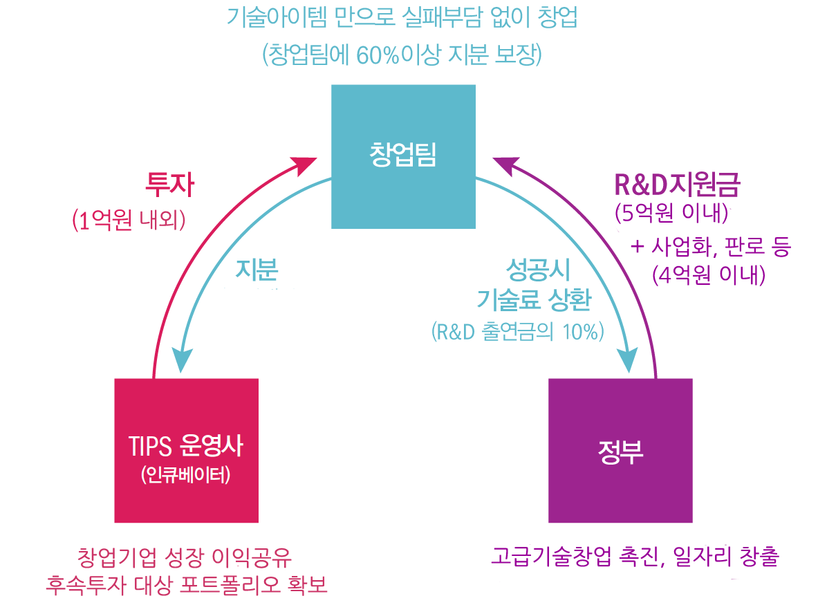 TIPS 프로그램은 창업자금 부족 및 낮은 기술창업 성공률 등으로 선뜻 창업에 나서기를 주저했던 우수한 고급기술인력의 기술창업 도전을 근본적으로 활성화 시키고자 합니다.